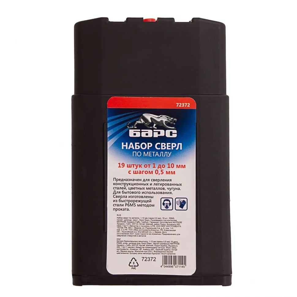 Набор сверл по металлу Барс 72372 включает 19 оснасток диаметром 1-10 мм (через 0,5 мм) из прокатанной стали P6M5, с цилиндрическим хвостовиком, в пластиковом боксе, и предназначен для сверления отверстий в металле и жестком пластике. В наборе сверла самых востребованных размеров, которые будут полезны в слесарной мастерской, во время ремонта, а также дома, в гараже или на даче.ПреимуществаСверла изготовлены из быстрорежущей стали, легированной вольфрамом и молибденом, поэтому устойчивы к слому под воздействием динамических нагрузок и высокой температуры.Режущие кромки долго сохраняют остроту, что обеспечивает оснасткам высокую износостойкость.Цилиндрические хвостовики сверл совместимы со всеми типами патронов.Набор поставляется в ударопрочном пластиковом кейсе, удобном для хранения и транспортировки.