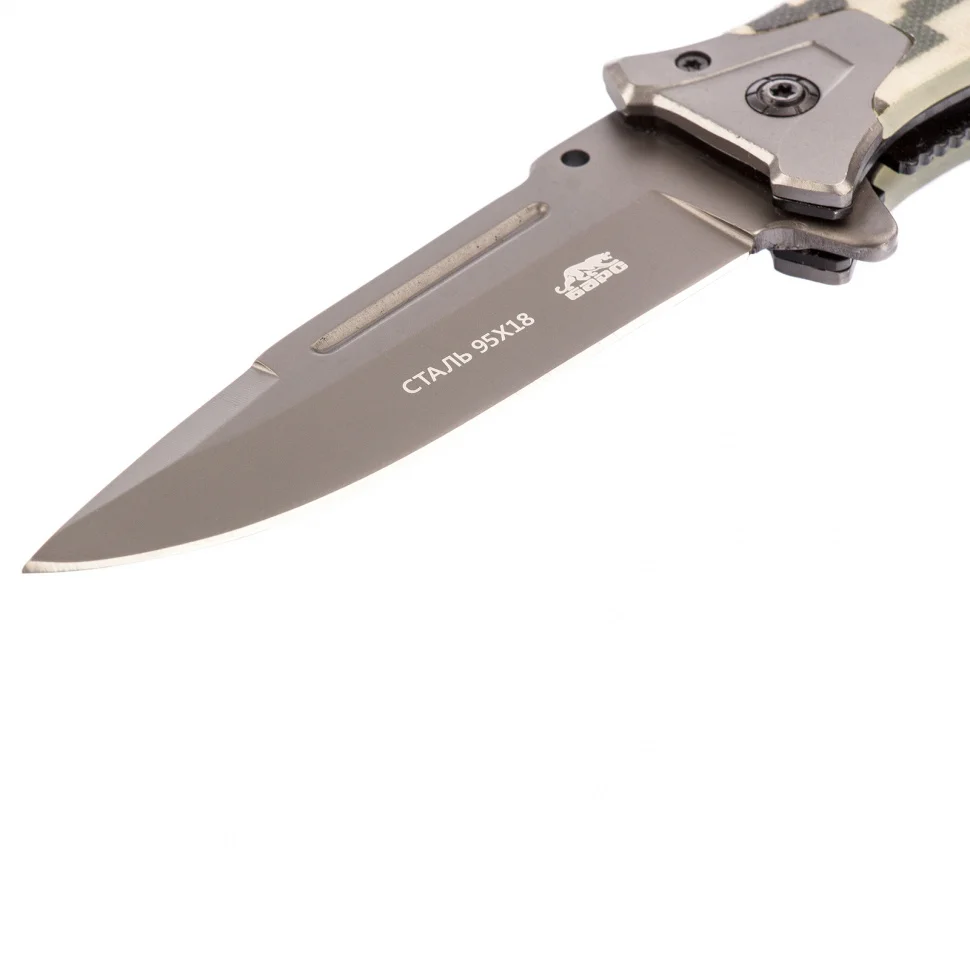 Складной туристический нож Барс 79202, 220мм/90мм, с системой Liner-Lock, накладкой G10 на рукоятке и стеклобоем, находит широкое применение при активном отдыхе на природе, на рыбалке и охоте. Встроенный механизм Liner-Lock позволяет быстро раскрывать нож одной рукой. А также нож оснащен стеклобоем, которым можно разбить стекло в аварийной ситуации.ПреимуществаВысокий ресурс и коррозионная стойкость — лезвие ножа выполнено из стали 95Х18 твердостью 56-58 HRC с титановым покрытием.Безопасность эксплуатации — двусторонний упор и рукоятка с многослойной накладкой G10 из стеклотекстолита предотвращают соскальзывание руки на лезвие.Удобная транспортировка — нож оснащен клипсой для фиксации на ремне и веревкой для закрепления на запястье.
