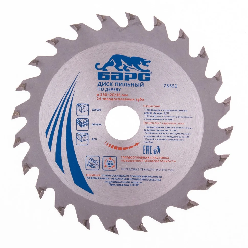 Пильный диск Барс 73351, ф130 х 20 мм, с 24 зубьями и кольцом 20/16 мм предназначен для быстрого пиления древесины мягких и твердых пород, ДСП, МДФ и фанеры. Тип зубьев АТВ и оптимально подобранный угол зуба позволяют производить как продольный, так и поперечный распил. Диск используется совместно с торцовочными и циркулярными пилами с посадкой 20 мм. В комплект входит переходное кольцо на диаметр 16 мм, расширяющее возможности применения оснастки. Диск подходит для интенсивной эксплуатации и может использоваться в профессиональной сфере.ПреимуществаПовышенная износостойкость - пластины изготовлены из сплава YG8 твердостью свыше 88 HRА с добавлением легирующих компонентов, формирующих мелкозернистую структуру материала.Надежность - корпус диска выполнен из инструментальной стали твердостью 42 HRC и устойчив к деформациям.Долгий срок службы - увеличенные твердосплавные пластины выдерживают ударные нагрузки и позволяют многократно проводить заточку диска.Прочное соединение пластин с зубьями - для пайки используется комбинированный припой с высоким содержанием серебра.