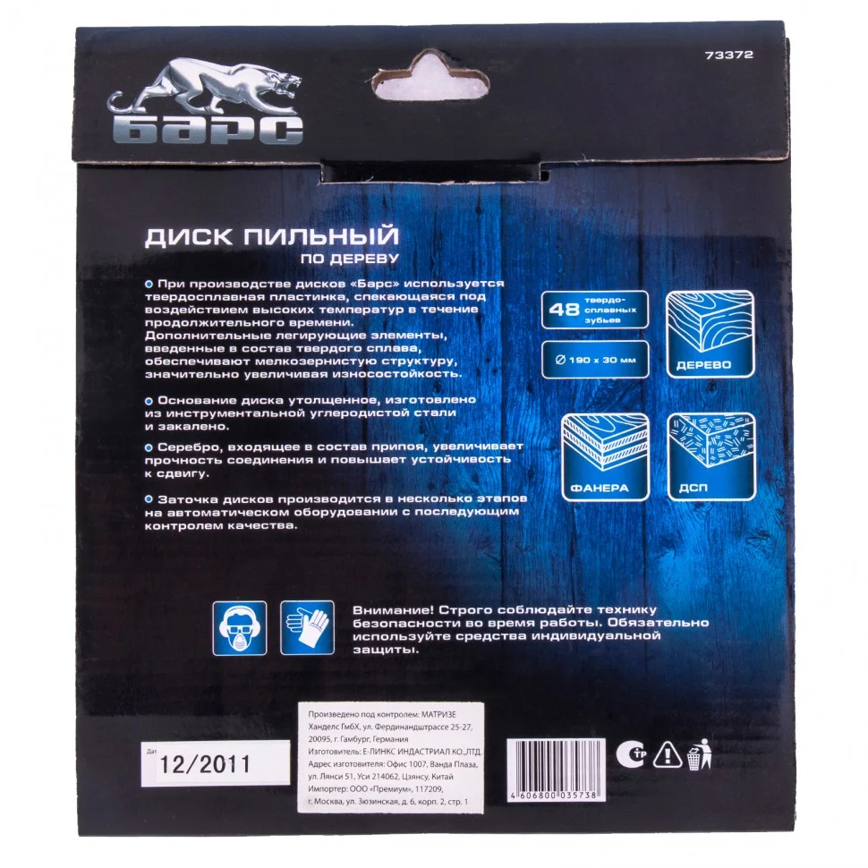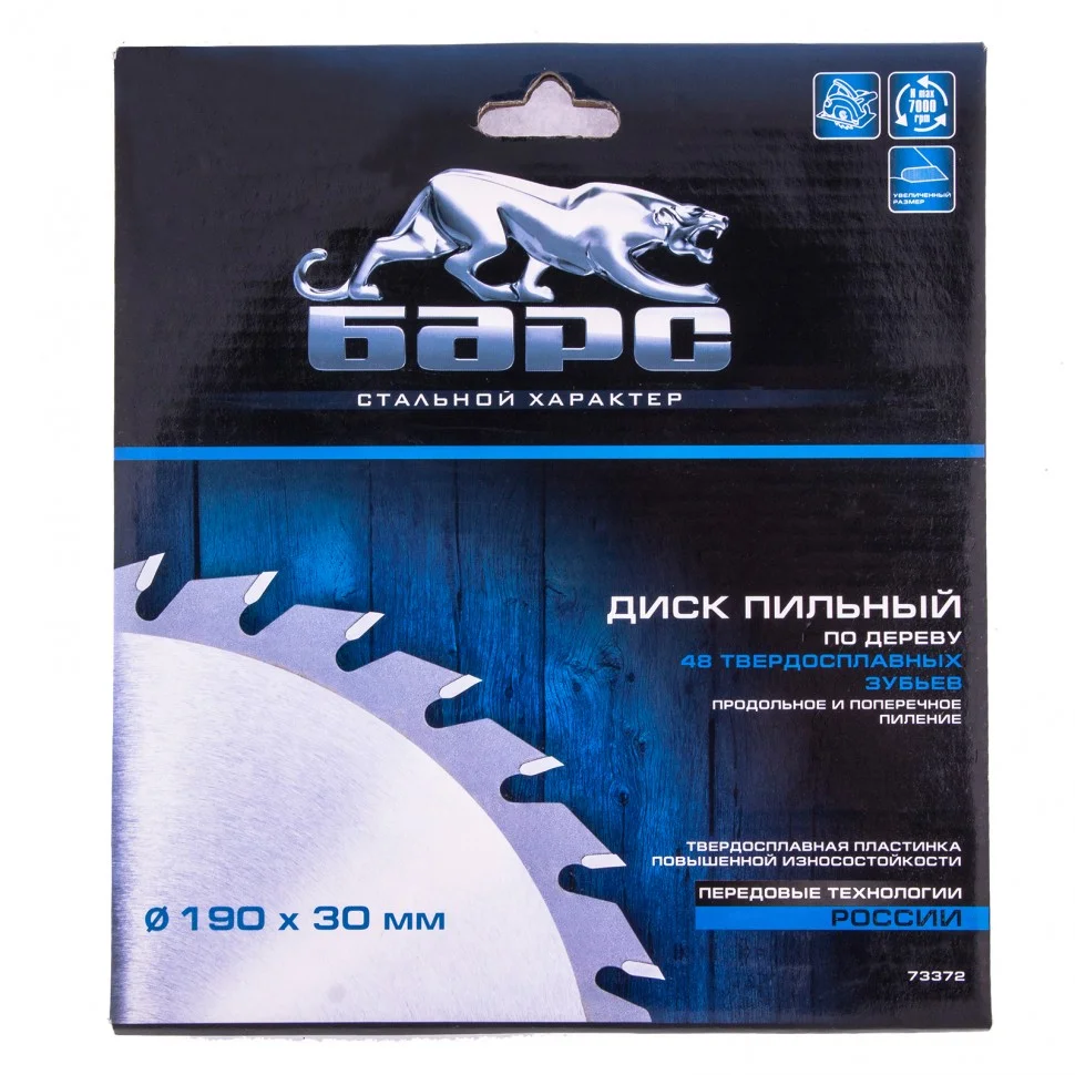 Пильный диск Барс 73372, ф190 х 30 мм, с 48 зубьями используется в качестве оснастки для циркулярных и торцовочных пил. За счет универсального типа зуба АТВ он позволяет быстро распиливать древесину мягких и твердых пород, фанеру, МДФ и ДСП в поперечном направлении, получая при этом ровный срез без сколов. Диск выдерживает интенсивное применение и рекомендован для проведения работ большого объема.ПреимуществаУвеличенные твердосплавные пластины выдерживают многократную заточку, что увеличивает срок службы диска.При напайке пластин использован комбинированный припой с добавлением серебра, обеспечивающий их надежную фиксацию на зубцах.Корпус изготовлен из инструментальной стали марки 50 твердостью 42 HRC, поэтому устойчив к нагрузкам.Компенсационные прорези защищают диск от заклинивания и деформации, что повышает качество реза.Режущие пластины выполнены из высокотвердого сплава карбида вольфрама ВК8 твердостью 88 HRA и имеют мелкозернистую структуру, поэтому обладают повышенной износостойкостью.