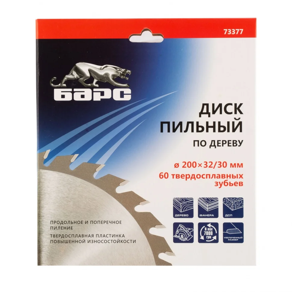 Пильный диск Барс 73377, ф200 х 32 мм, с 60 зубьями и кольцом 32/30 мм предназначен для точного и чистого пиления древесины мягких и твердых пород, ДСП, МДФ и фанеры. Мелкие зубья типа АТВ и оптимально подобранный угол зуба позволяют производить качественный поперечный распил. Диск используется совместно с торцовочными и циркулярными пилами с посадкой 32 мм. В комплект входит переходное кольцо на диаметр 30 мм, расширяющее возможности применения оснастки. Диск подходит для интенсивной эксплуатации и может использоваться в профессиональной сфере.ПреимуществаПовышенная износостойкость - пластины изготовлены из сплава YG8 твердостью свыше 88 HRА с добавлением легирующих компонентов, формирующих мелкозернистую структуру материала.Надежность - корпус диска выполнен из инструментальной стали твердостью 42 HRC и устойчив к деформациям.Долгий срок службы - увеличенные твердосплавные пластины выдерживают ударные нагрузки и позволяют многократно проводить заточку диска.Прочное соединение пластин с зубьями - для пайки используется комбинированный припой с высоким содержанием серебра.Компенсационные прорези - диск не деформируется при нагревании и позволяет получать стабильно ровный срез.