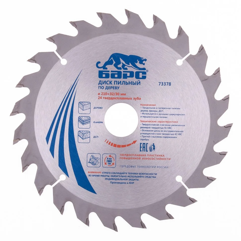 Пильный диск Барс 73378, ф210 х 32 мм, с 24 зубьями и кольцом 32/30 мм предназначен для быстрого пиления древесины мягких и твердых пород, ДСП, МДФ и фанеры. Тип зубьев АТВ и оптимально подобранный угол зуба позволяют производить как продольный, так и поперечный распил. Диск используется совместно с торцовочными и циркулярными пилами с посадкой 32 мм. В комплект входит переходное кольцо на диаметр 30 мм, расширяющее возможности применения оснастки. Диск подходит для интенсивной эксплуатации и может использоваться в профессиональной сфере.ПреимуществаПовышенная износостойкость - пластины изготовлены из сплава YG8 твердостью свыше 88 HRА с добавлением легирующих компонентов, формирующих мелкозернистую структуру материала.Надежность - корпус диска выполнен из инструментальной стали твердостью 42 HRC и устойчив к деформациям.Долгий срок службы - увеличенные твердосплавные пластины выдерживают ударные нагрузки и позволяют многократно проводить заточку диска.Прочное соединение пластин с зубьями - для пайки используется комбинированный припой с высоким содержанием серебра.Компенсационные прорези - диск не деформируется при нагревании и позволяет получать стабильно ровный срез.