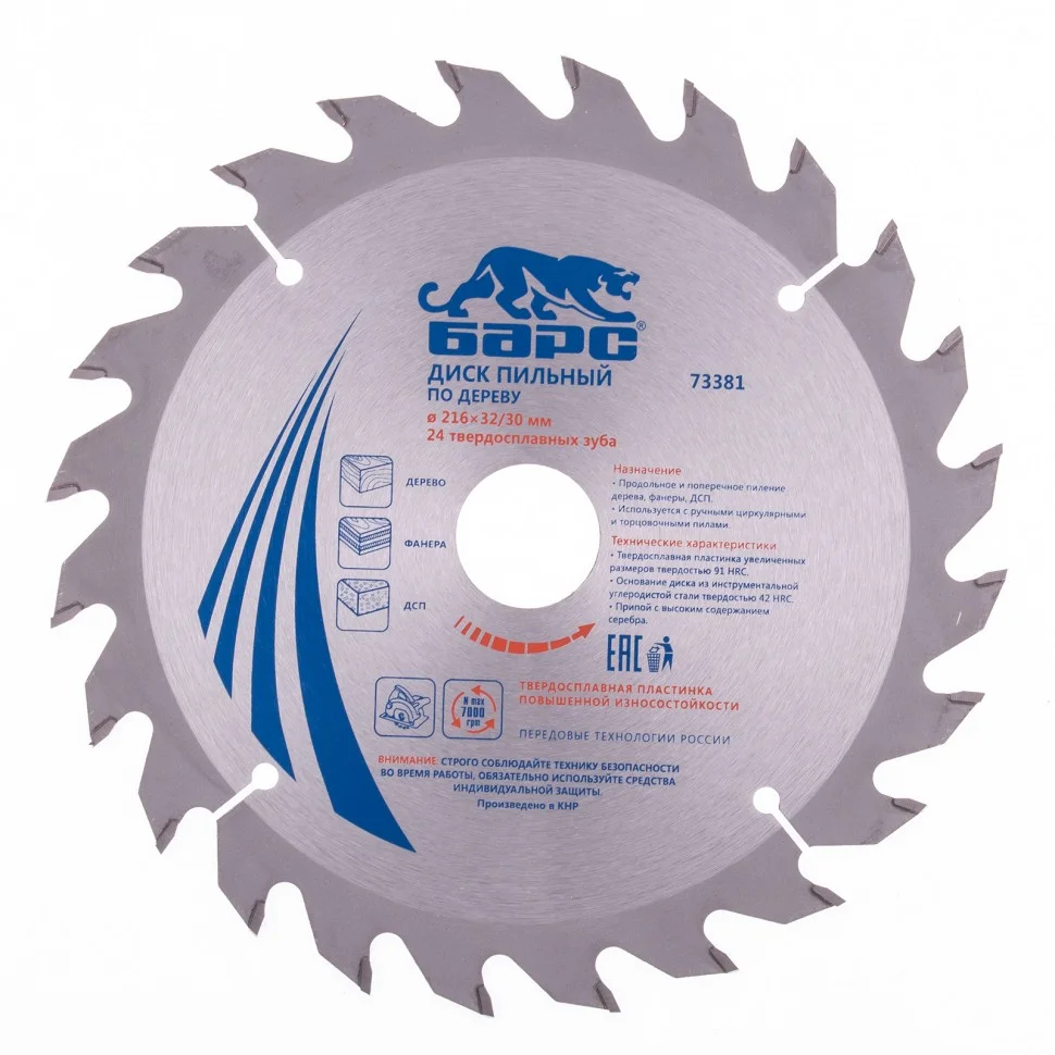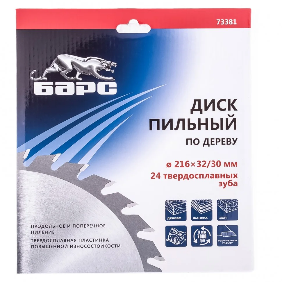 Пильный диск Барс 73381, ф216 х 32 мм, с 24 зубьями и кольцом 32/30 мм предназначен для быстрого пиления древесины мягких и твердых пород, ДСП, МДФ и фанеры. Тип зубьев АТВ и оптимально подобранный угол зуба позволяют производить как продольный, так и поперечный распил. Диск используется совместно с торцовочными и циркулярными пилами с посадкой 32 мм. В комплект входит переходное кольцо на диаметр 30 мм, расширяющее возможности применения оснастки. Диск подходит для интенсивной эксплуатации и может использоваться в профессиональной сфере.ПреимуществаПовышенная износостойкость - пластины изготовлены из сплава YG8 твердостью свыше 88 HRА с добавлением легирующих компонентов, формирующих мелкозернистую структуру материала.Надежность - корпус диска выполнен из инструментальной стали твердостью 42 HRC и устойчив к деформациям.Долгий срок службы - увеличенные твердосплавные пластины выдерживают ударные нагрузки и позволяют многократно проводить заточку диска.Прочное соединение пластин с зубьями - для пайки используется комбинированный припой с высоким содержанием серебра.Компенсационные прорези - диск не деформируется при нагревании и позволяет получать стабильно ровный срез.