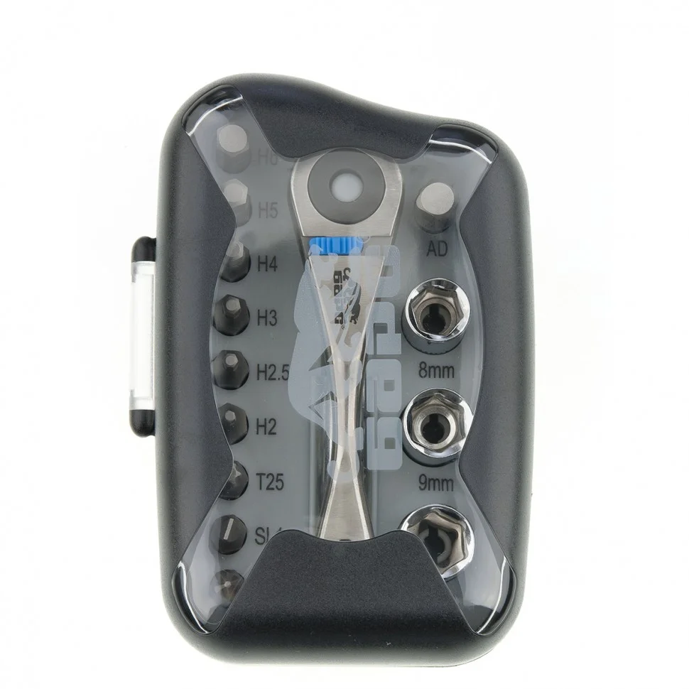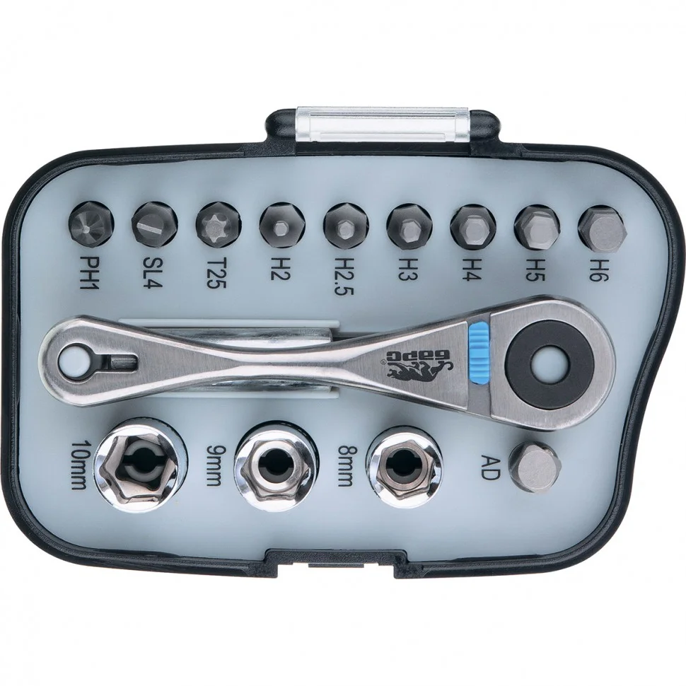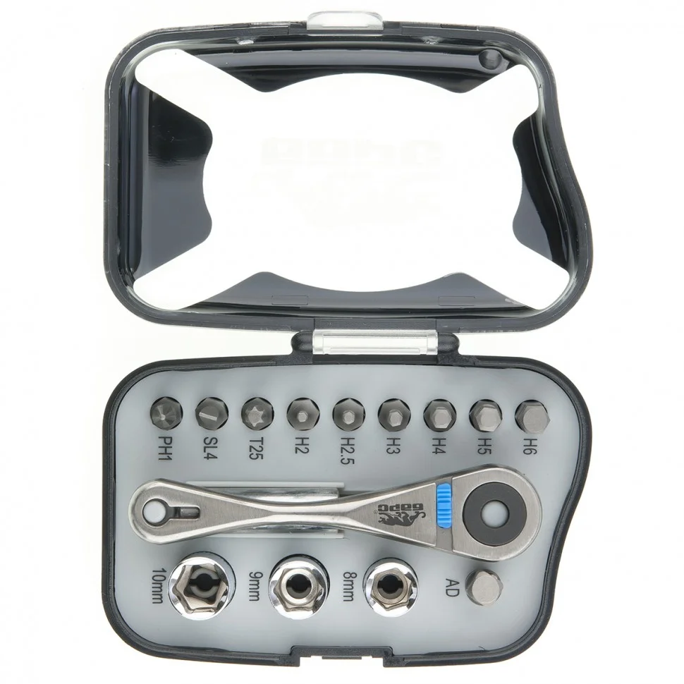 Трещотка с набором бит, изготовленных из хромованадиевой стали.Реверсивный механизм позволяет заворачивать и отворачивать крепеж, не перехватывая ручку.ОсобенностиСталь CrV.Твёрдость бит - 60 HRC.ПреимуществаРеверсивный механизм.КомплектностьТрещотка - 1 шт.Бита - 14 шт.Торцевые головки: 8, 9, 10 мм.Биты с профилем PH1, SL4, T25, H2, H2.5, H3, H4, H5, H6.