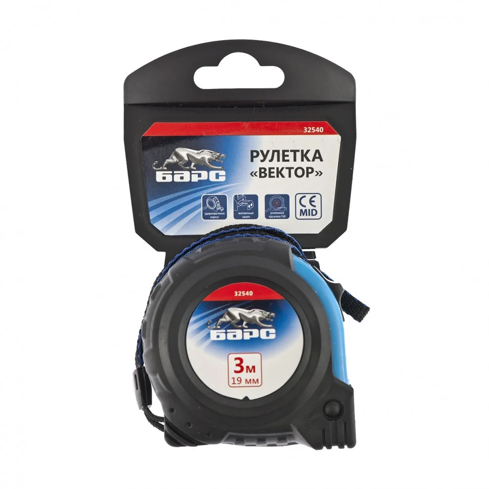 Рулетка Барс Вектор 32540 с утолщенным полотном 3 м х 19 мм и магнитным зацепом, в обрезиненном корпусе, используется при проведении линейных измерений. Незаменима в хозяйстве и на строительной площадке для вычисления размеров заготовок, конструкций и т.д.ПреимуществаКорпус выполнен из ABS-пластика и имеет резиновый чехол, что обеспечивает защиту от ударного воздействия.Долговечность механизма рулетки гарантирует рабочая пружина из стали 60 Mn.Высокий ресурс полотна достигается за счет его утолщения и ширины 19 мм.Магнитный зацеп на полотне обеспечивает возможность фиксации с металлическими поверхностями.Полотно покрыто белой краской и имеет крупную шкалу, благодаря чему результаты измерений легко считываются.Рулетка оснащена нейлоновым ремешком и клипсой для удобства работы и транспортировки.