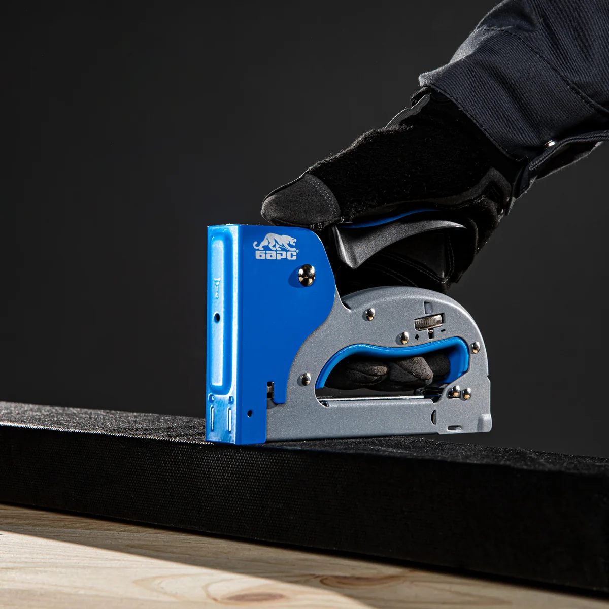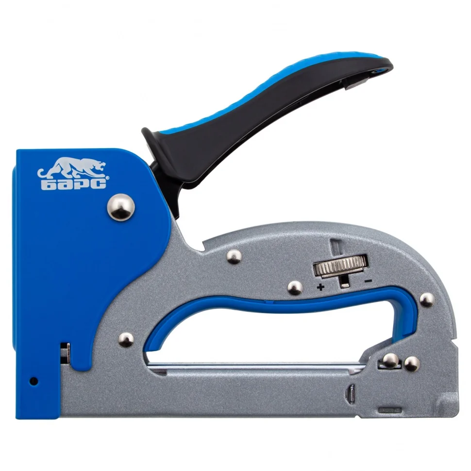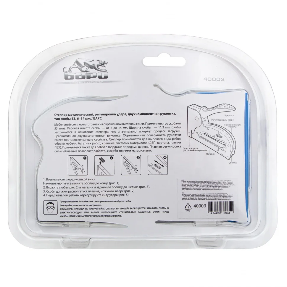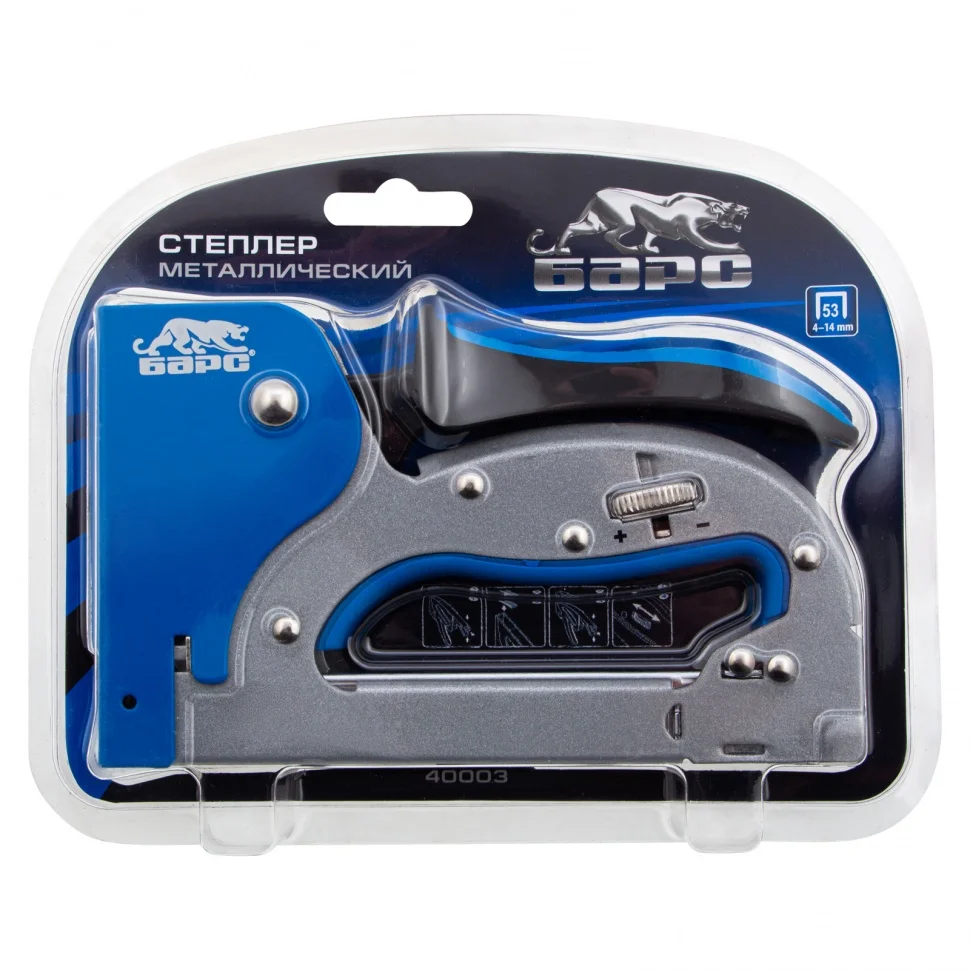 Металлический степлер Барс 40003 с функцией регулировки удара, с двухкомпонентной рукояткой, совместим со скобами типа 53 размером 4-14 мм и применяется для быстрого скрепления с деревянными основаниями листов фанеры, оргалита, ДСП, ДВП, картона или изоляционных материалов. Инструмент подходит для частого использования, т. к. ударный механизм рессорного типа снижает усталость при длительной эксплуатации. Степлер пригодится во время сборки и обивки мебели, а также для проведения ремонтных работ.ПреимуществаВысокая прочность — корпус изготовлен из стали методом штамповки.Удобная работа с твердыми материалами — регулятор мощности удара позволяет контролировать глубину забивания скоб.Быстрая подготовка к работе — выдвижная обойма позволяет за несколько секунд загрузить скобы в скобоприемник.Простой контроль наличия крепежа — в корпусе имеется смотровое окошко.Комфортная работа — обрезиненная рукоятка не выскальзывает из ладони.Безопасное хранение и транспортировка — механизм фиксации рукоятки в нерабочем состоянии предотвращает случайное срабатывание степлера.