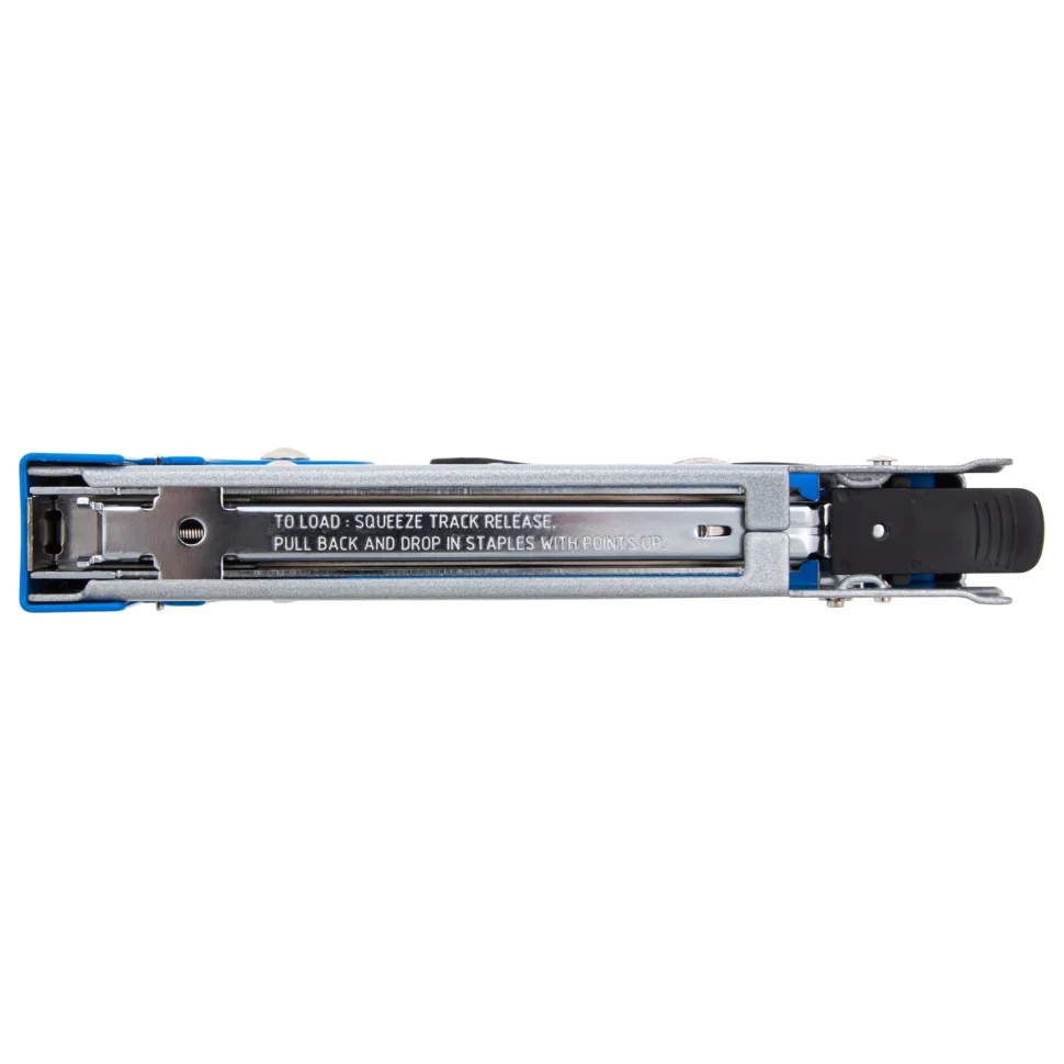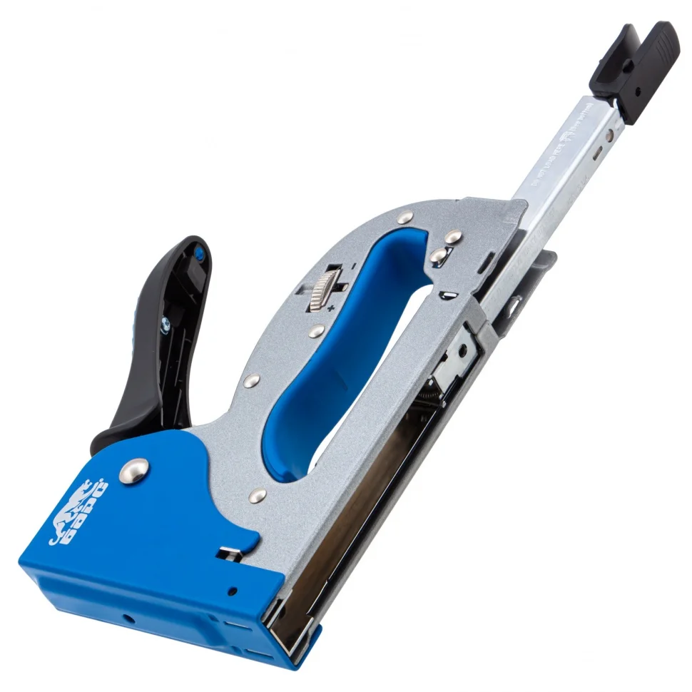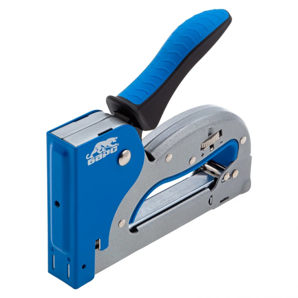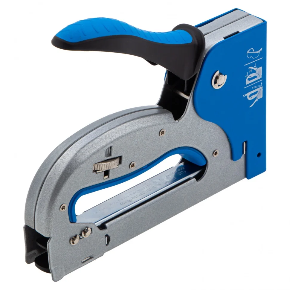 Металлический степлер Барс 40003 с функцией регулировки удара, с двухкомпонентной рукояткой, совместим со скобами типа 53 размером 4-14 мм и применяется для быстрого скрепления с деревянными основаниями листов фанеры, оргалита, ДСП, ДВП, картона или изоляционных материалов. Инструмент подходит для частого использования, т. к. ударный механизм рессорного типа снижает усталость при длительной эксплуатации. Степлер пригодится во время сборки и обивки мебели, а также для проведения ремонтных работ.ПреимуществаВысокая прочность — корпус изготовлен из стали методом штамповки.Удобная работа с твердыми материалами — регулятор мощности удара позволяет контролировать глубину забивания скоб.Быстрая подготовка к работе — выдвижная обойма позволяет за несколько секунд загрузить скобы в скобоприемник.Простой контроль наличия крепежа — в корпусе имеется смотровое окошко.Комфортная работа — обрезиненная рукоятка не выскальзывает из ладони.Безопасное хранение и транспортировка — механизм фиксации рукоятки в нерабочем состоянии предотвращает случайное срабатывание степлера.