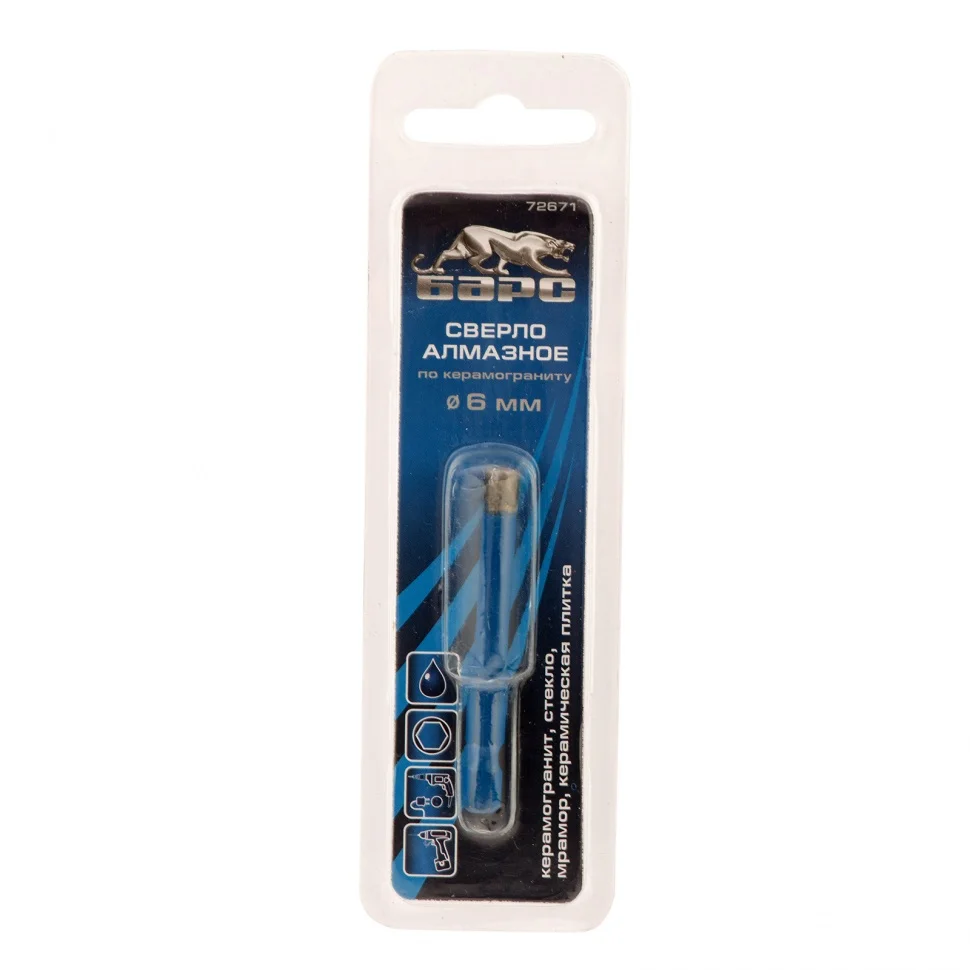 Алмазное сверло Барс 72671, 6 х 35 мм, с 6-гранным хвостовиком, устанавливается на дрели и шуруповерты для сверления керамогранита, стекла, керамической плитки, мрамора. Кольцевой тип сверла повышает скорость работы, т.к. не требуется удаление всего материала во время сверления. Режущий инструмент рассчитан преимущественно на профессиональное применение с большими объемами работ. Водяное охлаждение в процессе работы позволяет добиться многократного увеличения ресурса сверла.ПреимуществаУвеличенная высота алмазного слоя 8 мм и режущая часть, выполненная методом горячего спекания, повышают ресурс и надежность сверла.Эмалевое покрытие обеспечивает высокую защиту сверла от коррозии при мокром сверлении.Сверло оснащено шестигранным хвостовиком, поэтому не прокручивается и может устанавливаться как в трехкулачковый патрон, так и в патрон шуруповерта.Специальное окошко на корпусе позволяет эффективно удалять шлам во время работы.Для более точного позиционирования сверла можно использовать кондуктор 72833, который облегчает начало работ.