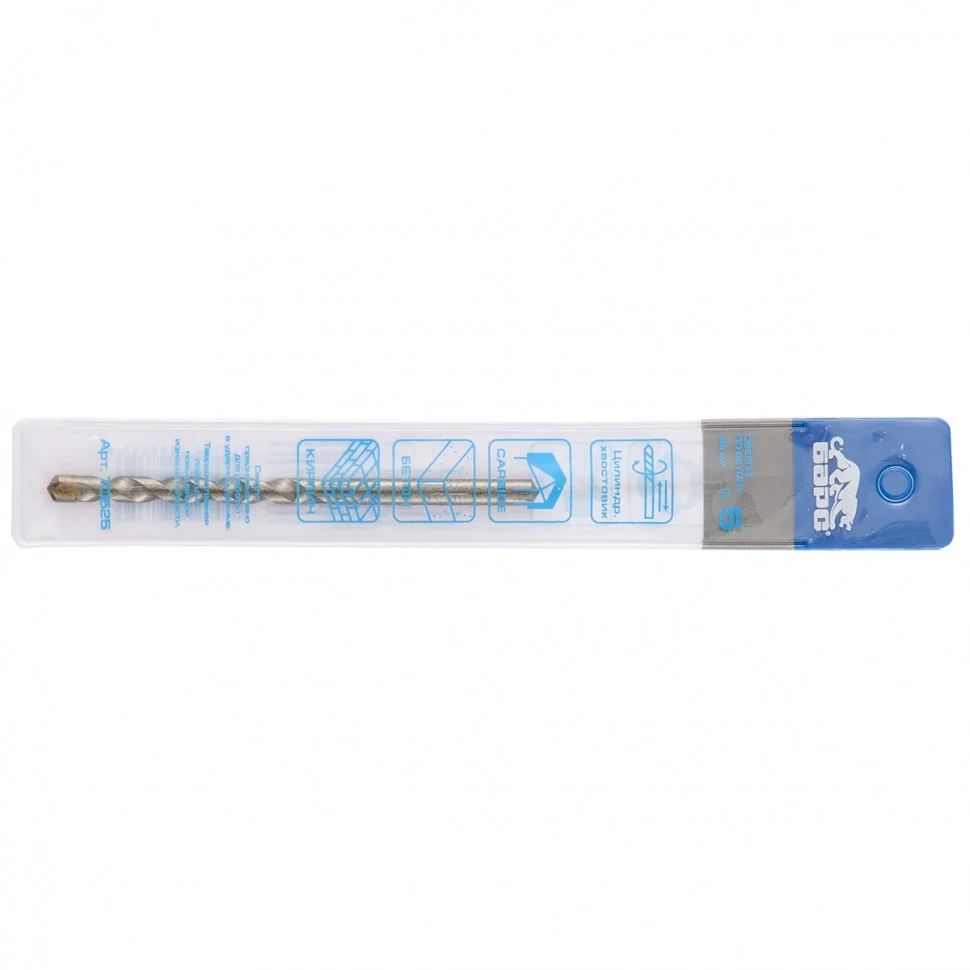 Сверло по бетону Барс 70525, 5 х 85 мм, Carbide TIP, с цилиндрическим хвостовиком, применяют для сверления каменных и бетонных поверхностей. Сверло изготовлено из стали 40Х, легированной хромом, поэтому устойчиво к слому под воздействием динамических нагрузок. Его можно использовать с дрелью или шуруповертом, работающими в ударном режиме. Сверло обладает наивысшим ресурсом среди аналогичных моделей конкурентов. Оно пригодится во время строительных и ремонтных работ.ПреимуществаРежущая пластина из сплава карбида вольфрама ВК8 имеет твердость 80-90 HRC, что обеспечивает сверлу повышенную износостойкость.Твердосплавная пластина надежно зафиксирована специальным припоем, поэтому оснастка выдерживает нагрев и ударное воздействие.Благодаря продуманной форме спиральной части пыль своевременно удаляется из отверстия, и сверло не перегревается, что повышает его производительность и увеличивает длительность службы.