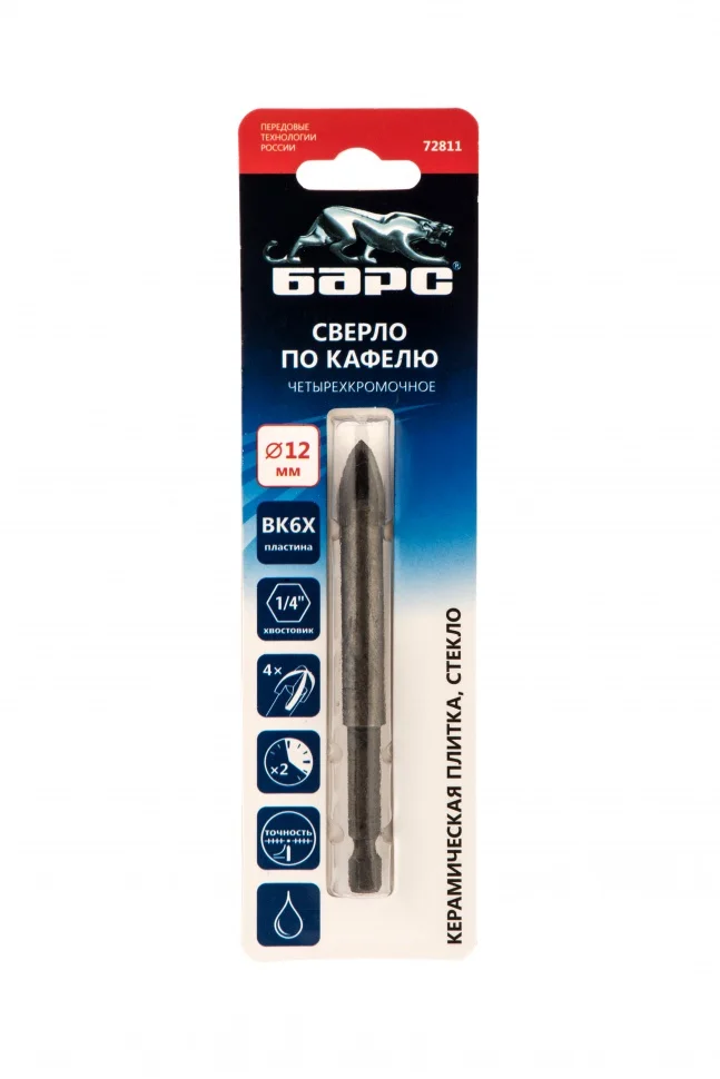 Сверло Барс 72811, 12 мм, с крестовой пластинкой и шестигранным хвостовиком, рассчитано на сверление керамической плитки и стекла. Благодаря 4-гранной режущей пластине оно обеспечивает высокую скорость засверливания. Сверло подходит для интенсивного профессионального использования. В процессе работы рекомендуется применять водяное охлаждение для увеличения ресурса сверла.ПреимуществаПластина изготовлена из сплава YG6X, что гарантирует долговечность сверла и легкое засверливание.Коррозионностойкое покрытие предотвращает появление ржавчины на сверле, поэтому оно не разрушается от воздействия воды.За счет 6-гранного хвостовика сверло не прокручивается в патроне и может устанавливаться в быстросъемные адаптеры.