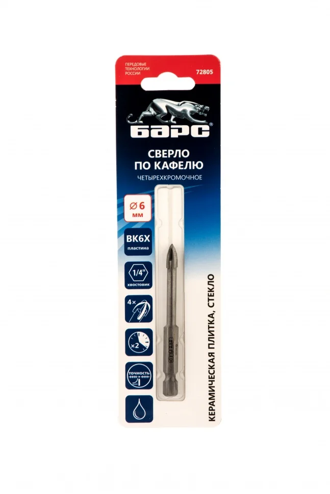 Сверло по керамической плитке 6 мм, крестовая пластинка, шестигранный хвостовик Барс 72805