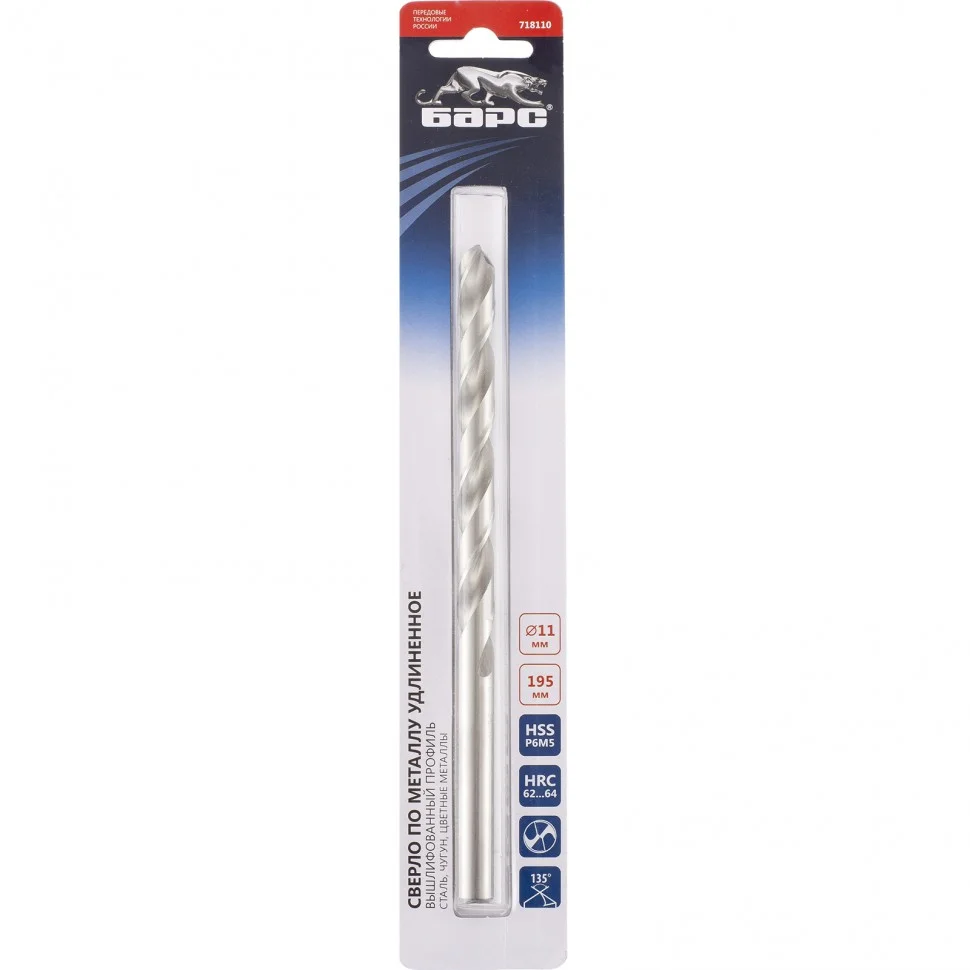 Сверло спиральное по металлу, 11 х 195 мм, Р6М5, удлиненное Барс 718110