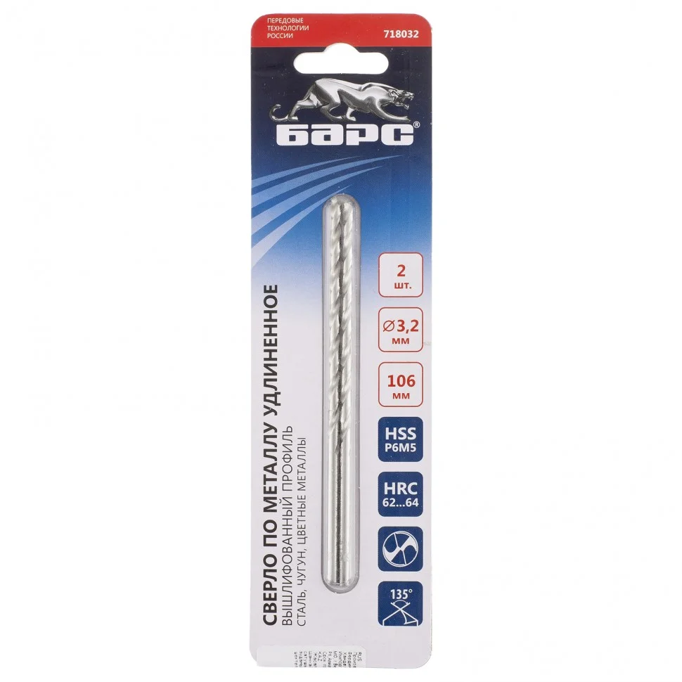 Сверло спиральное по металлу, 3.2 х 106 мм, Р6М5, удлиненное, 2 шт Барс 718032