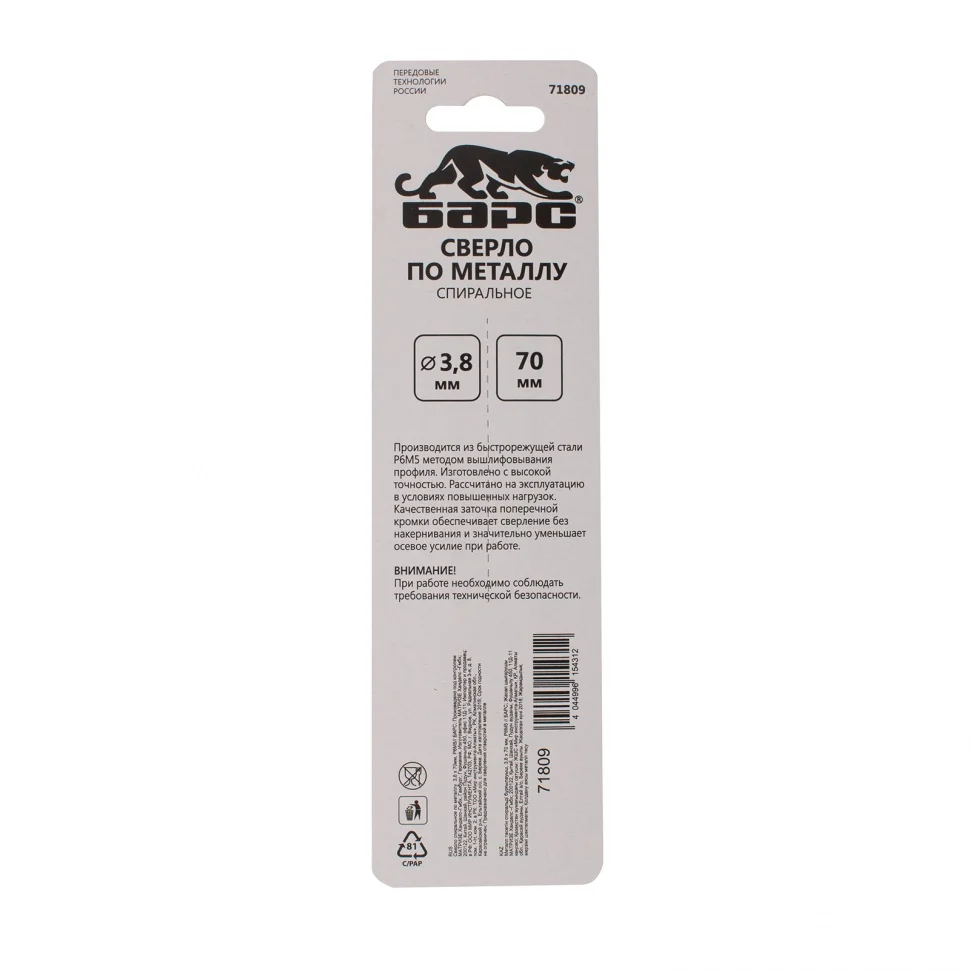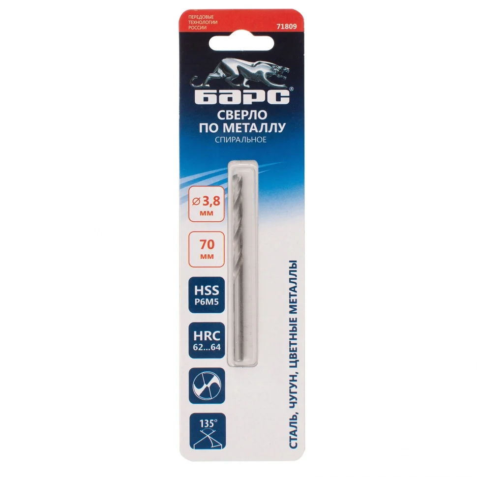 Сверло спиральное по металлу, 3.8 x 70 мм, Р6М5 Барс 71809