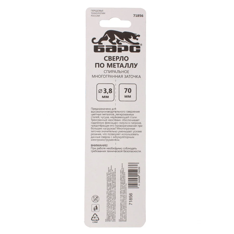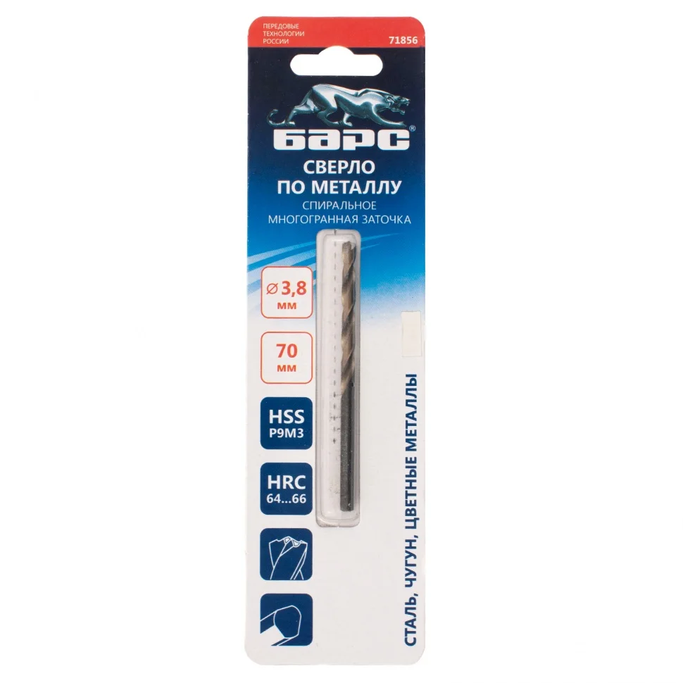 Сверло спиральное по металлу, 3.8 x 70 мм, Р9М3, многогранная заточка Барс 71856