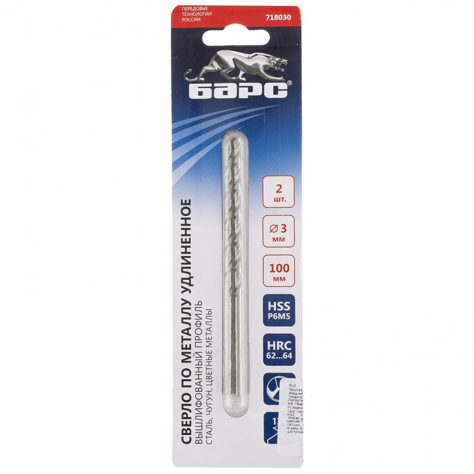 Удлиненное спиральное сверло по металлу Барс 718030 из стали P6M5, 3 х 100 мм, 2 шт. в упаковке, — оснастка для получения отверстий в легированных и цветных металлах — меди, алюминии, мягкой бронзе, титане, латуни. Насадка эффективно справляется с этими задачами благодаря углу заточки 135 градусов. Обеспечивает высокое качество работ, поскольку имеет класс точности A. Сверло устойчиво к перегреву и динамическим нагрузкам, т.к. изготовлено из высококачественной быстрорежущей стали твердостью 62-64 HRC. Удлиненный профиль оснастки позволяет сверлить глубокие отверстия. Сверло используется для монтажно-сборочных работ.ПреимуществаРежущие кромки долго держат заточку, поэтому сверло имеет высокий ресурс работоспособности.Подточенная поперечная кромка уменьшает осевую нагрузку и облегчает засверливание.Благодаря вышлифованному профилю и точному соблюдению геометрии оснастки сокращается время сверления.Поверхность сверла отполирована, что снижает трение о стенки отверстия и улучшает отвод стружки.Равномерное удаление стружки уменьшает нагрев сверла и повышает его производительность.Сверло имеет цилиндрический хвостовик, совместимый со всеми типами патронов.