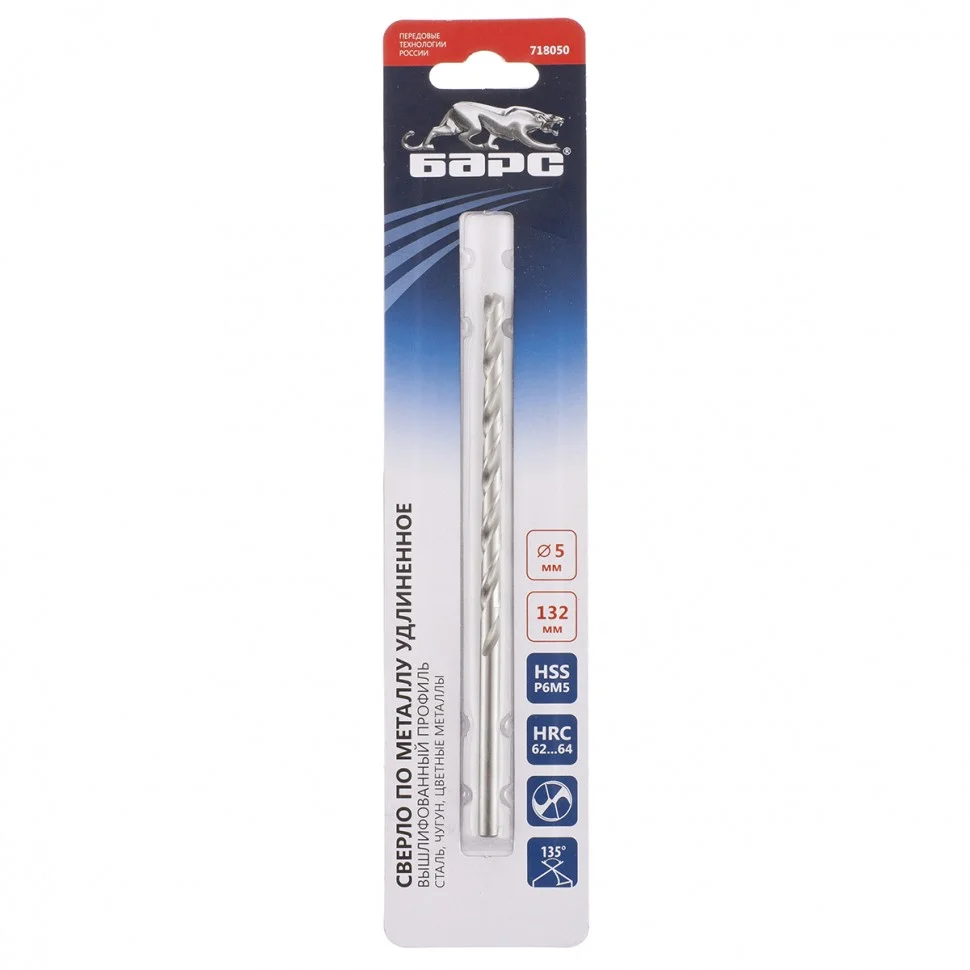 Сверло спиральное по металлу, 5 х 132 мм, Р6М5, удлиненное Барс 718050
