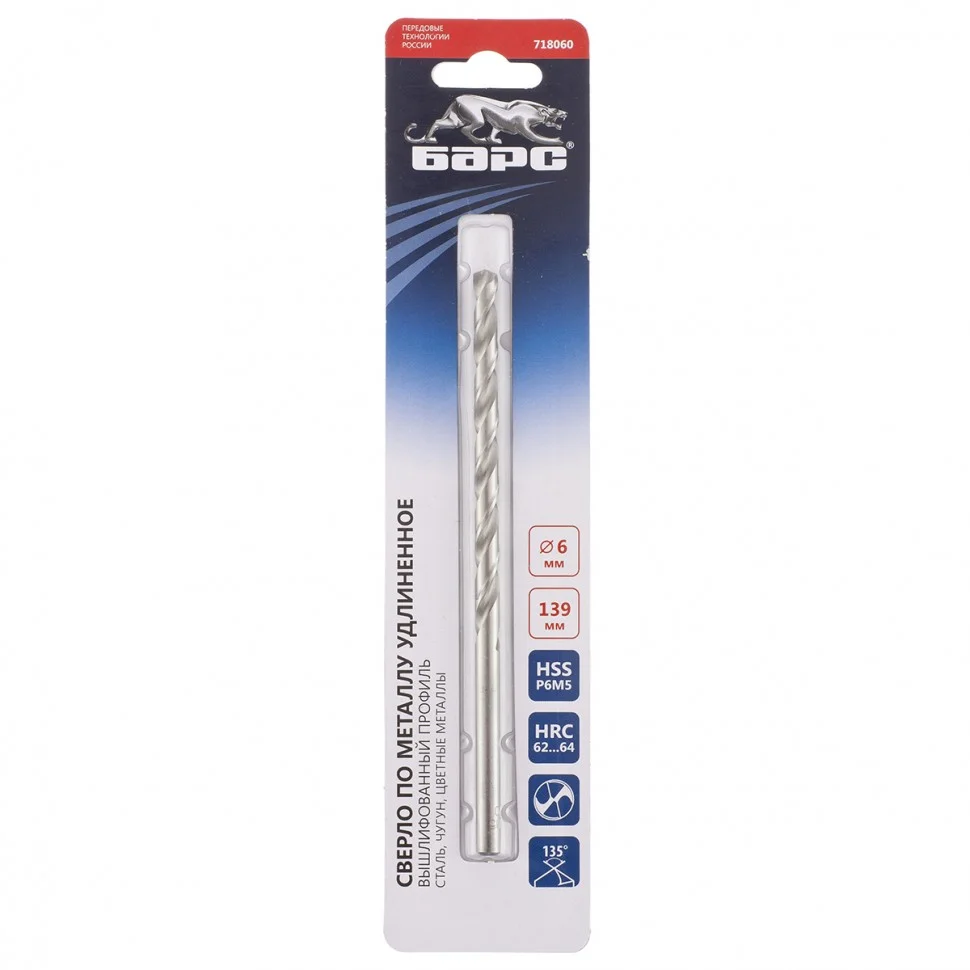 Сверло спиральное по металлу, 6 х 139 мм, Р6М5, удлиненное Барс 718060