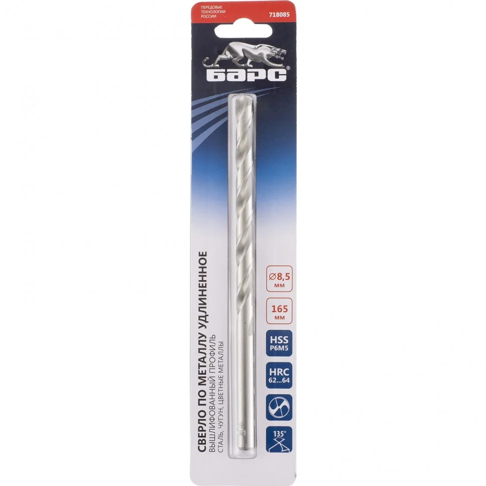 Сверло спиральное по металлу, 8.5 х 165 мм, Р6М5, удлиненное Барс 718085