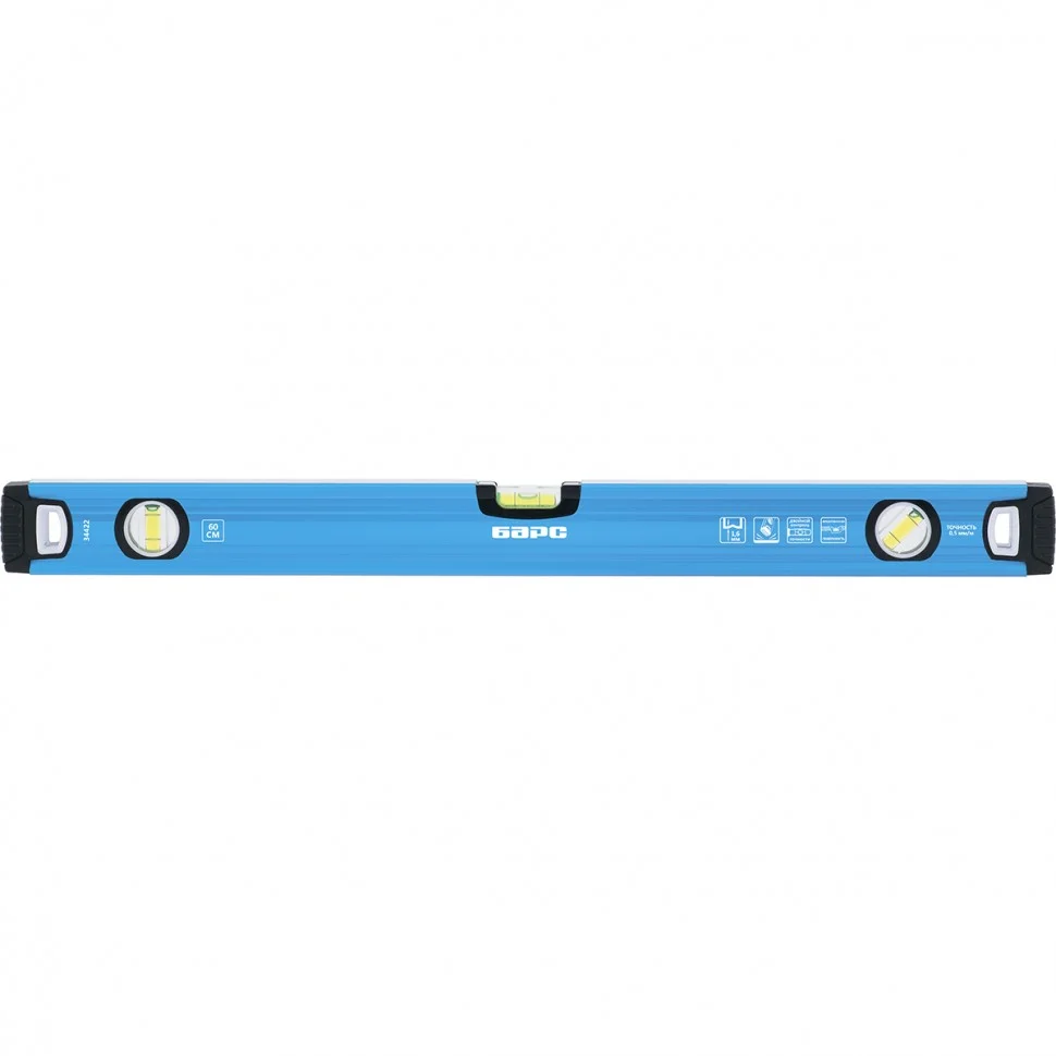 Фрезерованный алюминиевый уровень Барс 34432 длиной 1800 мм, с профилем 1,6 мм и ударопрочными заглушками, оснащен 3 глазками, которые позволяют проверить вертикальные, горизонтальные поверхности и соответствие наклонных поверхностей углу 45 градусов. Инструмент повышает точность строительных и ремонтных работ.Для определения отклонения вертикали 90 градусов необходимо использовать пузырьковую ампулу только в верхнем положении уровня. Только базовая поверхность является рабочей (противоположная ампуле 180 градусов).ПреимуществаИнструмент изготовлен из легкого и прочного алюминиевого профиля (марка 6063).Высокая точность работы достигается за счет фрезерованной рабочей части и двойного контроля при установке ампул.V-образная форма подошвы обеспечивает возможность фиксации инструмента на трубах при проведении сантехнических работ.Уровень выдерживает падения с небольшой высоты за счет заглушек из износостойкой термопластичной резины (TPR).Строительный уровень удобно хранить на крючке, т.к. в боковых частях имеются отверстия.