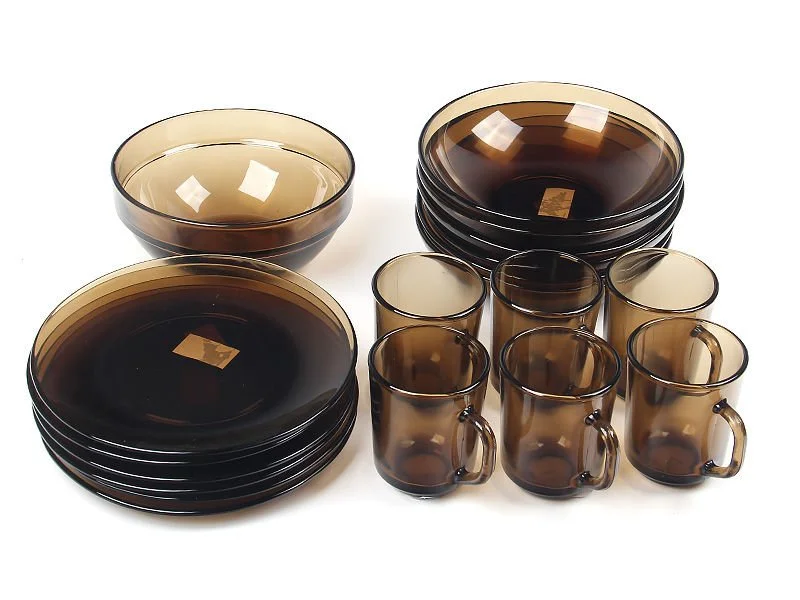 Изящный столовый сервиз из прозрачного дымчатого стекла — практичный подарок и выгодное приобретение. Посуда отлично подходит для ежедневного использования.