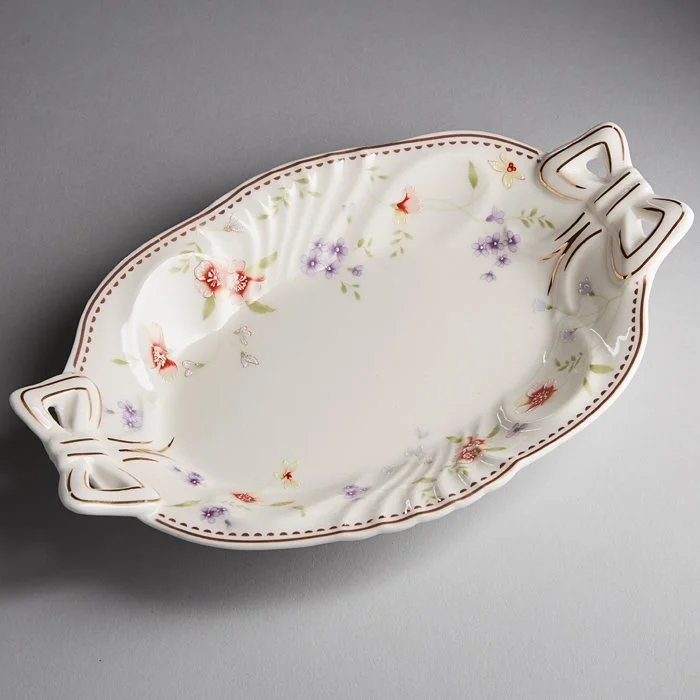 - Блюдо из высококачественного фарфора с декоративным рисунком и золотой обводкой