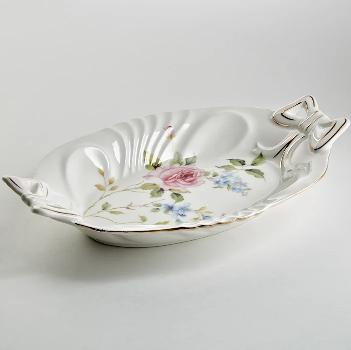 - Блюдо из высококачественного фарфора с декоративным рисунком и золотой обводкой