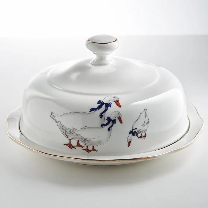 - Блюдо для блинов с крышкой из высококачественного фарфора с декоративным рисунком и золотой обводкой
