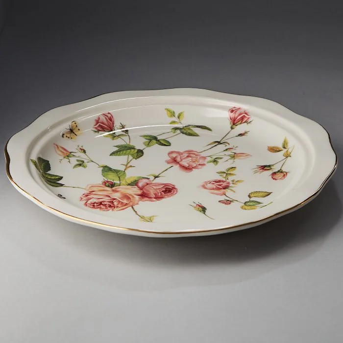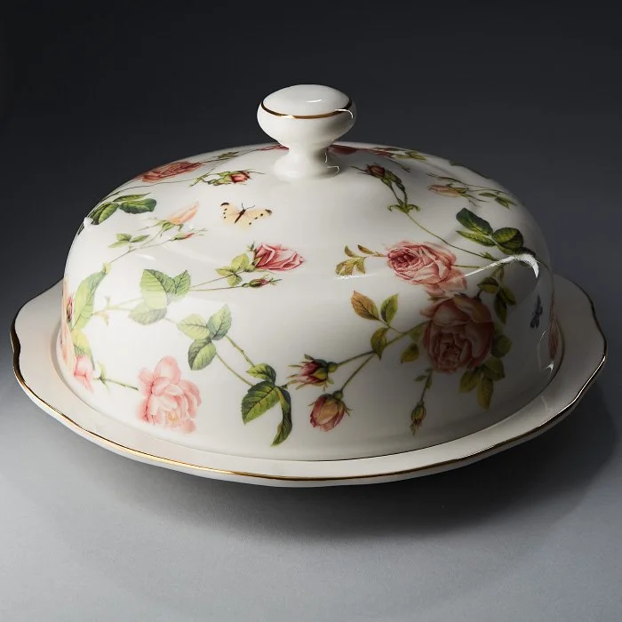 - Блюдо-блинница с крышкой из высококачественного фарфора с декоративным рисунком и золотой обводкой