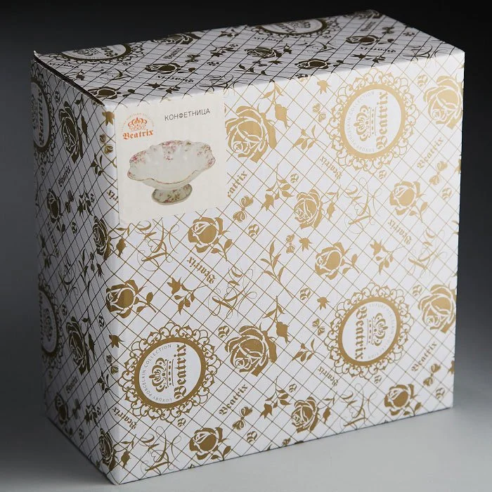 - Конфетница из высококачественного фарфора с декоративным рисунком и золотой обводкой