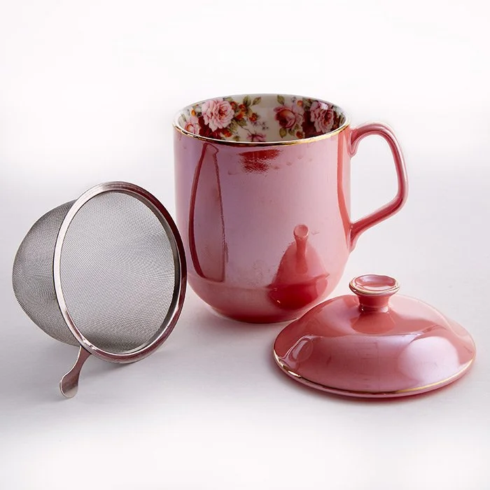 - Кружка с крышкой заварочная из высококачественного фарфора цветная с внутренним декоративным рисунком и золотой обводкой