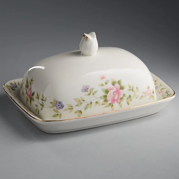 - Масленка из высококачественного фарфора с декоративным рисунком и золотой обводкой
