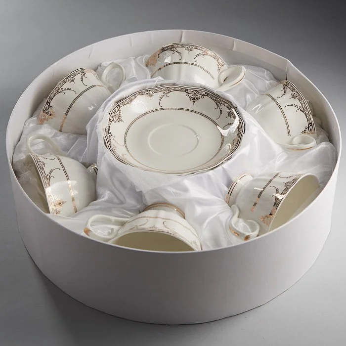 - Набор чайный из высококачественного фарфора с декоративным рисунком и золотой обводкой