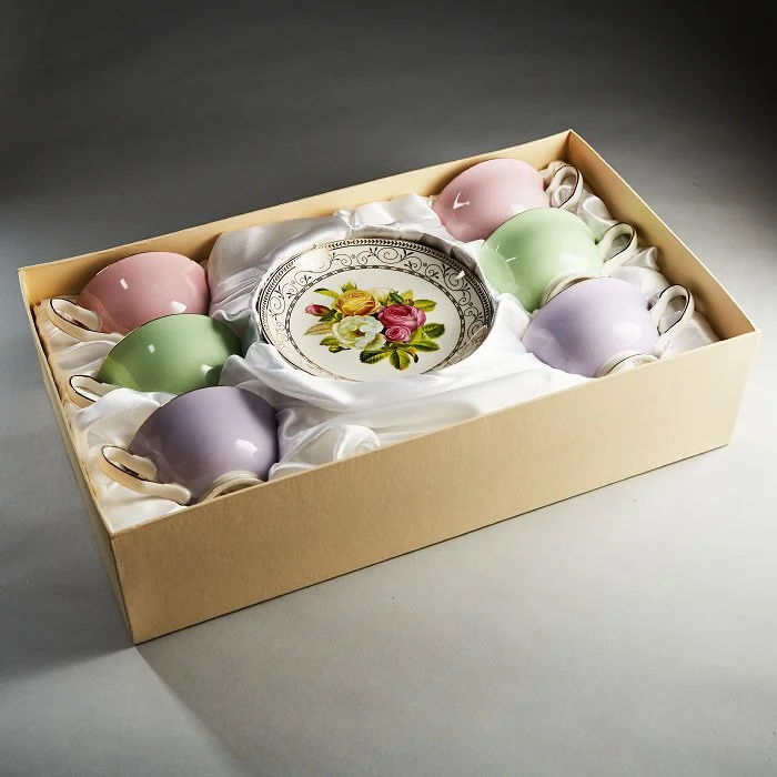 - Набор чайный из высококачественного фарфора с декоративным рисунком и золотой обводкой