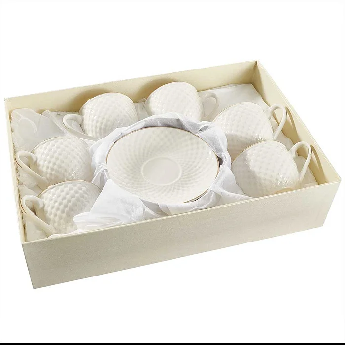 - Набор чайный из высококачественного белого фарфора с рельефным рисунком и золотой обводкой