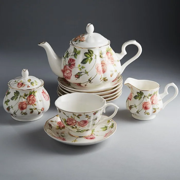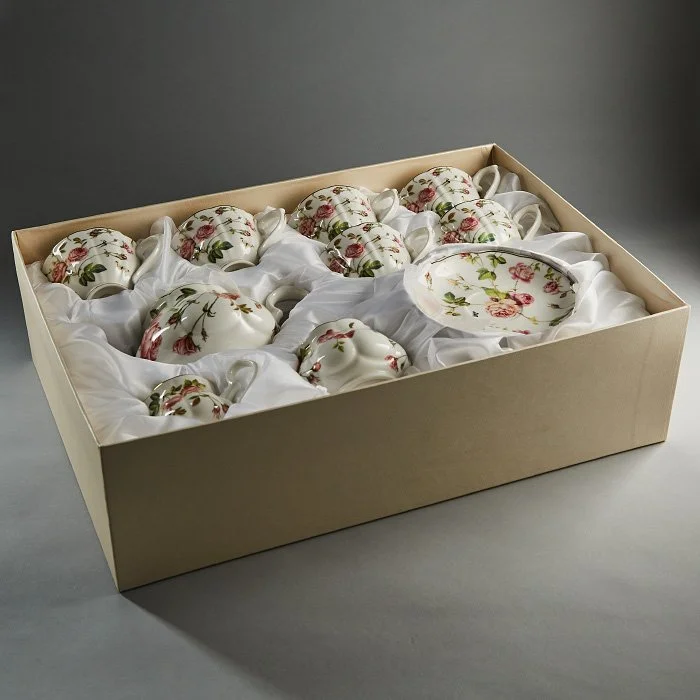 - Набор чайный из высококачественного фарфора с декоративным рисунком и золотой обводкой
