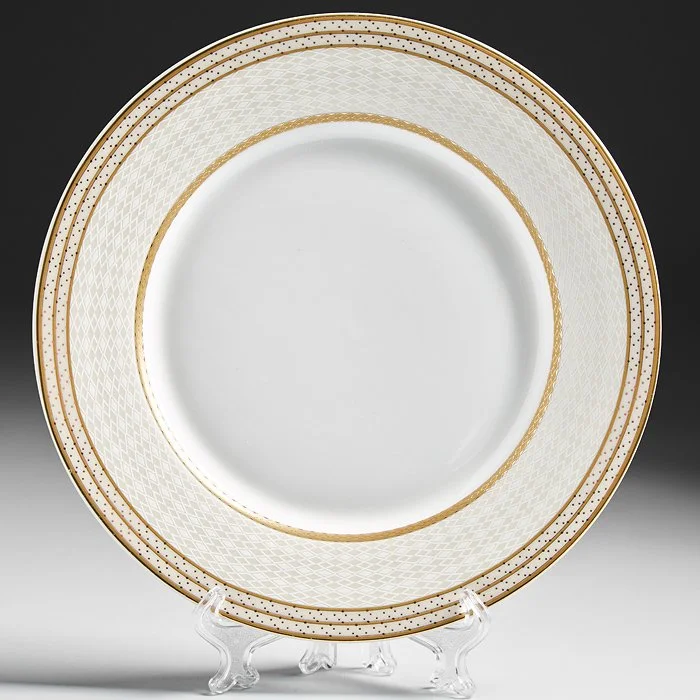 - Набор тарелок из высококачественного фарфора с декоративным рисунком и золотой обводкой