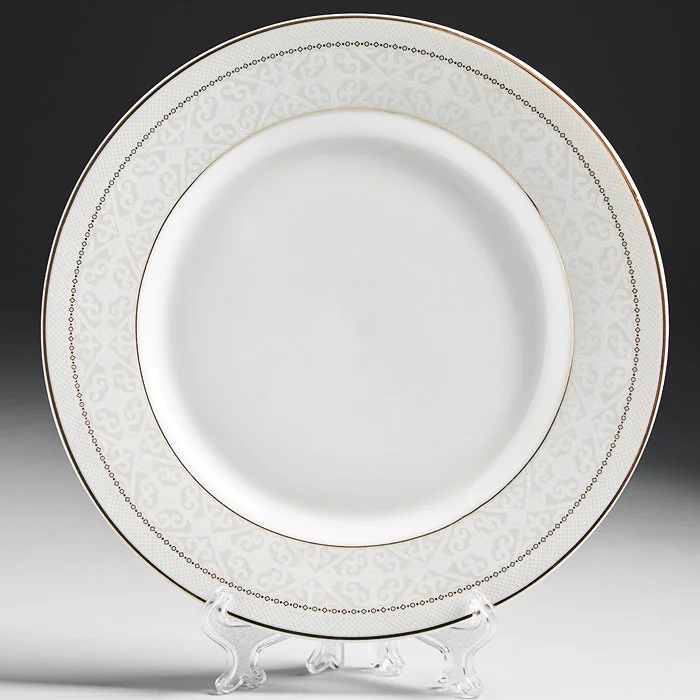 - Набор тарелок из высококачественного фарфора с декоративным рисунком и золотой обводкой
