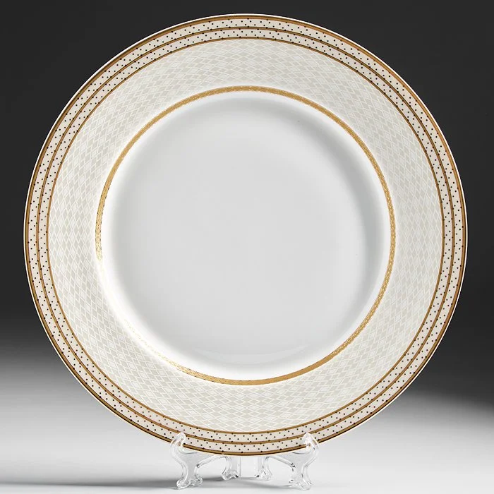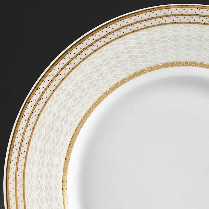 - Набор тарелок из высококачественного фарфора с декоративным рисунком и золотой обводкой