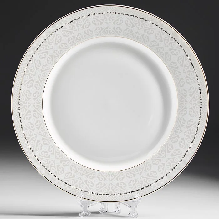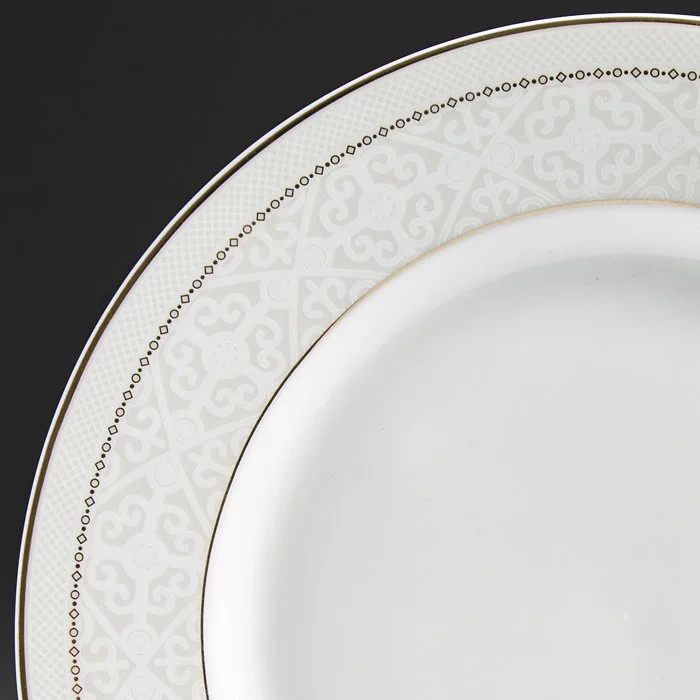 - Набор тарелок из высококачественного фарфора с декоративным рисунком и золотой обводкой