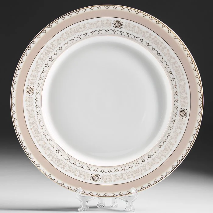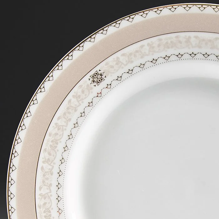 - Набор тарелок из высококачественного фарфора с декоративным рисунком и золотой обводкой