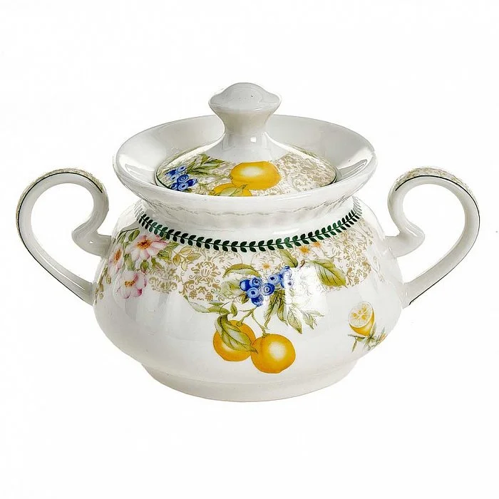 - Сахарница из высококачественного фарфора с декоративным рисунком и золотой обводкой