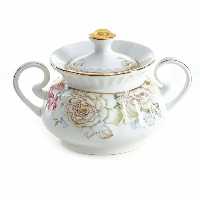 - Сахарница из высококачественного фарфора с декоративным рисунком и золотой обводкой