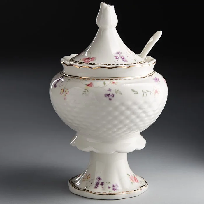 - Сахарница из высококачественного фарфора с декоративным рисунком и золотой обводкой
