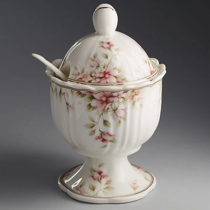 - Сахарница из высококачественного фарфора с декоративным рисунком и золотой обводкой