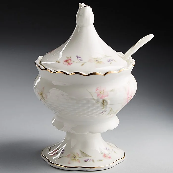 - Сахарница из высококачественного фарфора с декоративным рисунком и золотой обводкой