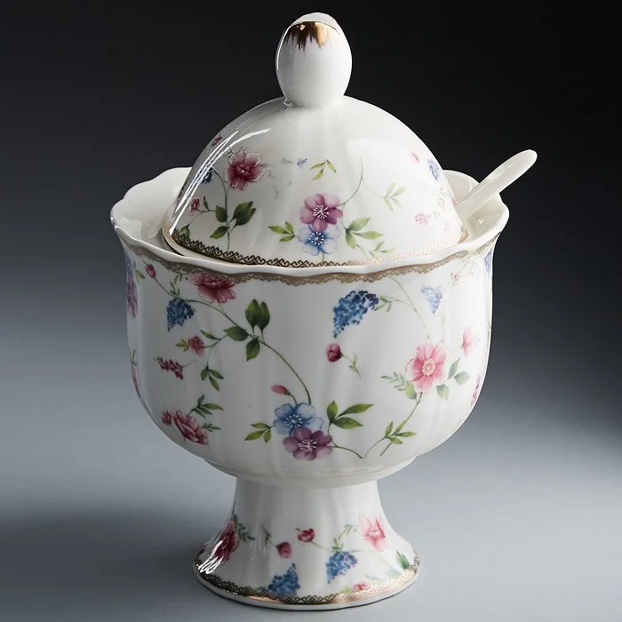- Сахарница из высококачественного фарфора с декоративным рисунком и золотой обводкой