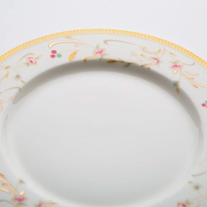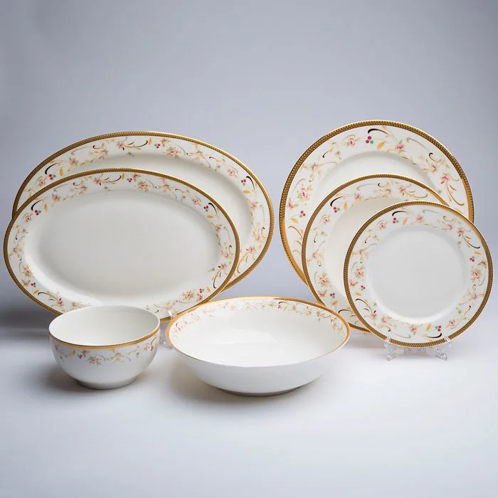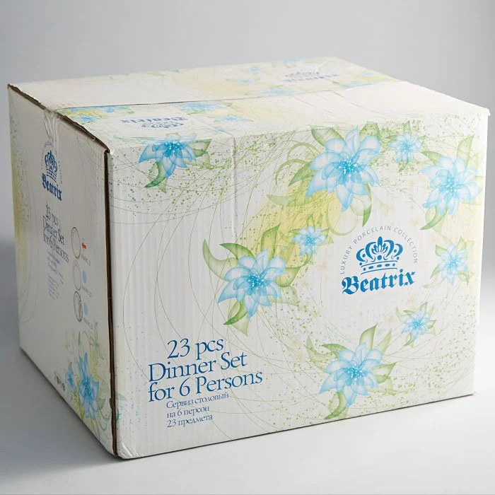 - Столовый сервиз на 6 персон из высококачественного фарфора с декоративным рисунком и золотой обводкой в цветной коробке