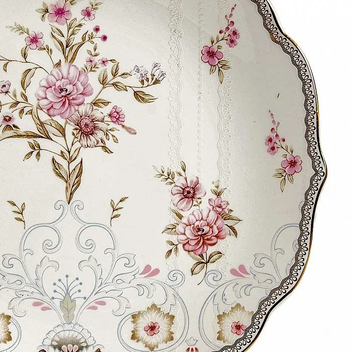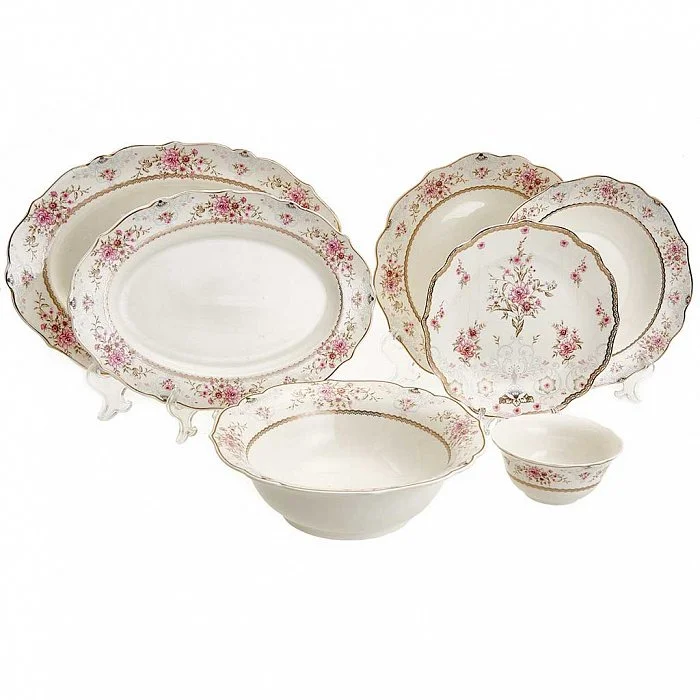 - Столовый сервиз на 6 персон из высококачественного фарфора с декоративным рисунком и золотой обводкой