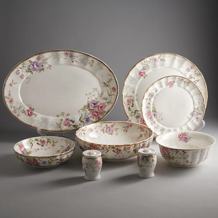 - Столовый сервиз на 6 персон из высококачественного фарфора с декоративным рисунком и золотой обводкой